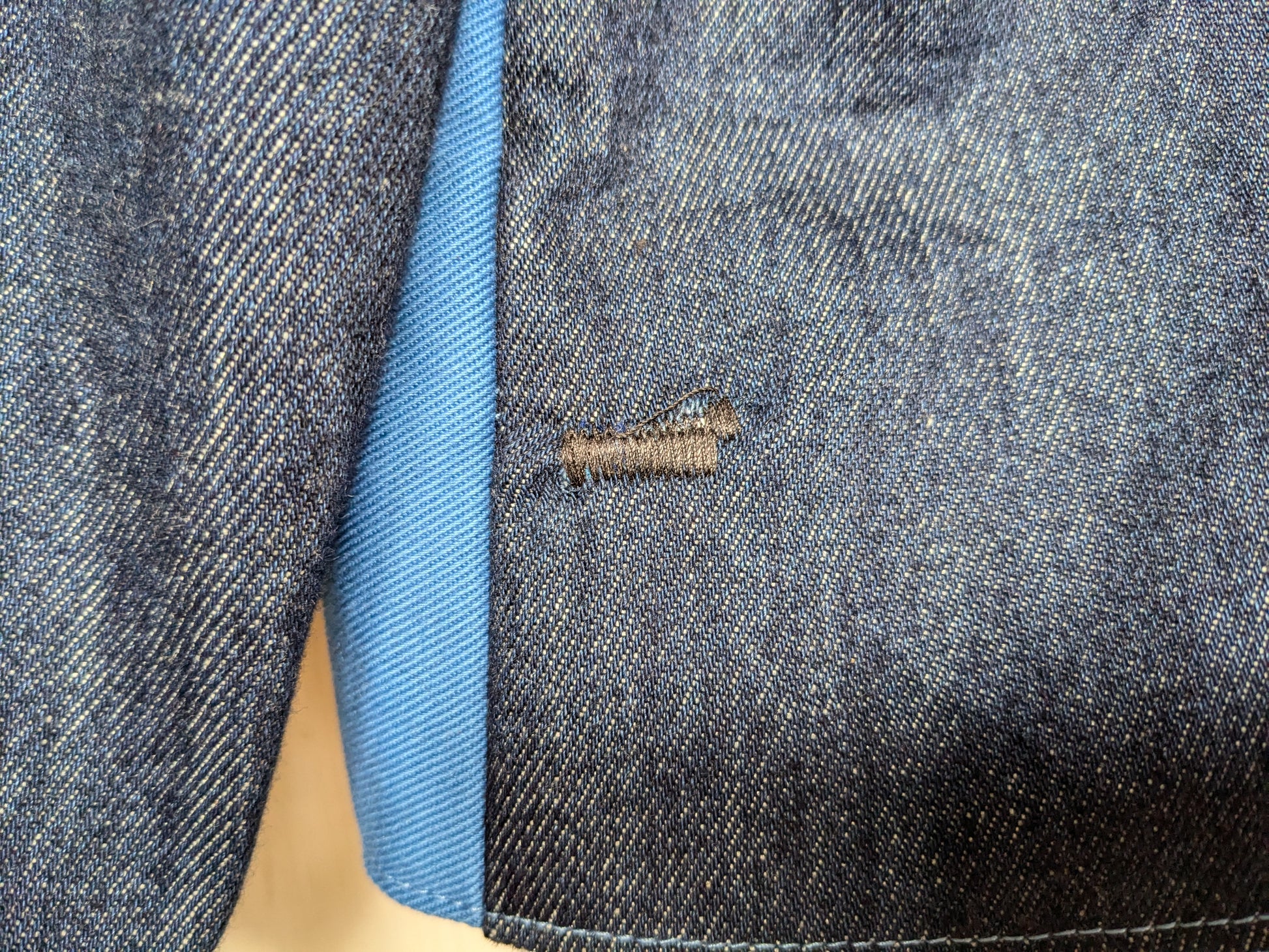 A fantastic handmade mid-seasonal jacket with a retro twist. Handmade jacket colour blocked with a plain blue drill fabric remnant, an indigo denim remnant and some vintage 60's/70's floral printed fabric. The floral fabric has been placed asymetrically along the CF and the collar has been split between fabrics creating a unique effect. Square boxy shape with two side shaping darts, two lined front patch pockets and cropped sleeves. Cropped length and chunky plastic zip to fasten. The under collar and facings have been made from a cotton viscose in matching cornflower blue.(Please note there is a small repair to a rip in the fabric on the lower left side of the back, please see final pic). Size 16 (Please note the fit is big in the photos), please see below measurements;
