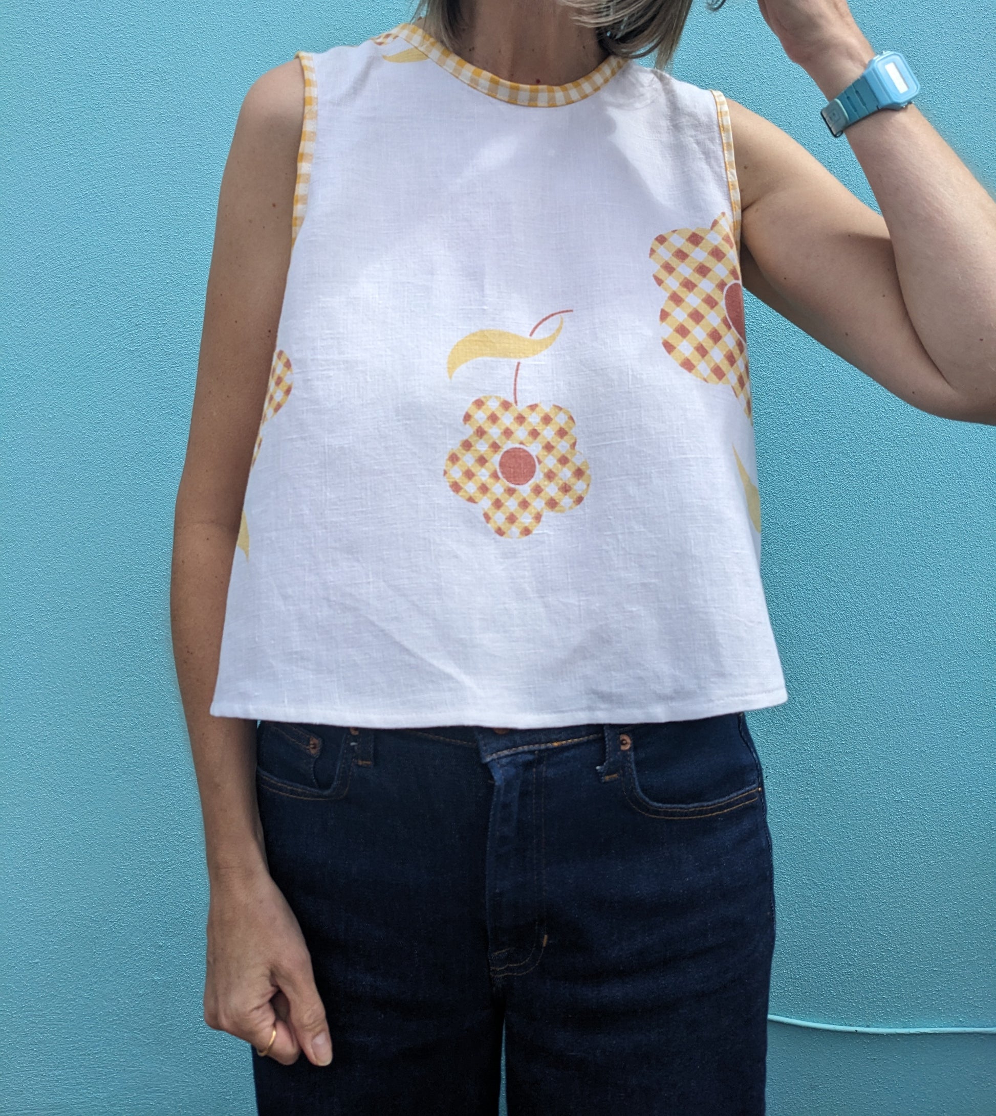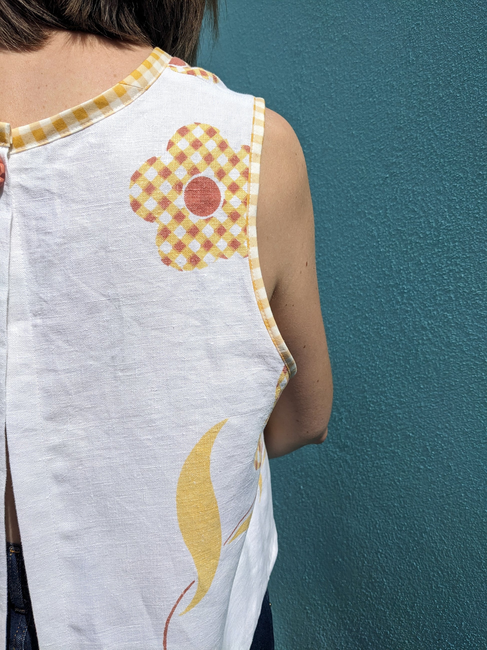 A unique handmade top made from a vintage linen mid-century tablecloth. The simple sleeveless shell silhouette is made more interesting as the top is open at and fastens at the back with a single vintage flower button. Yellow and white gingham bias trimmed armholes. Loose easy to wear, slightly A-line cut with scooped-out armholes, perfect for the summer. Would fit between a size 10-14 depending on the fit, please see below measurements;